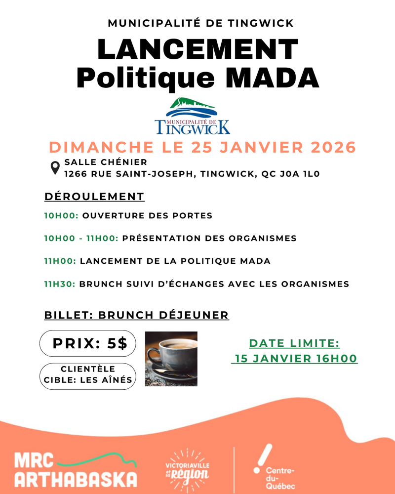 La Municipalité de Tingwick est fière de rappeler le lancement de la démarche MADA (Municipalité amie des aînés), une initiative importante visant à améliorer la qualité de vie de nos aînés et à bâtir une communauté encore plus inclusive.
