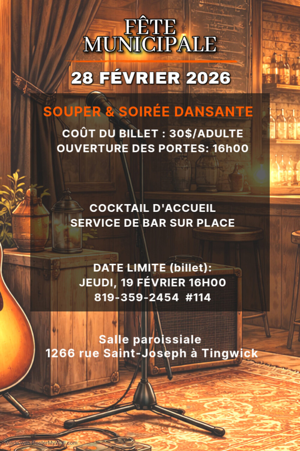 La Municipalité de Tingwick a le plaisir de vous inviter à sa fête municipale, qui se tiendra le samedi 28 février 2026.